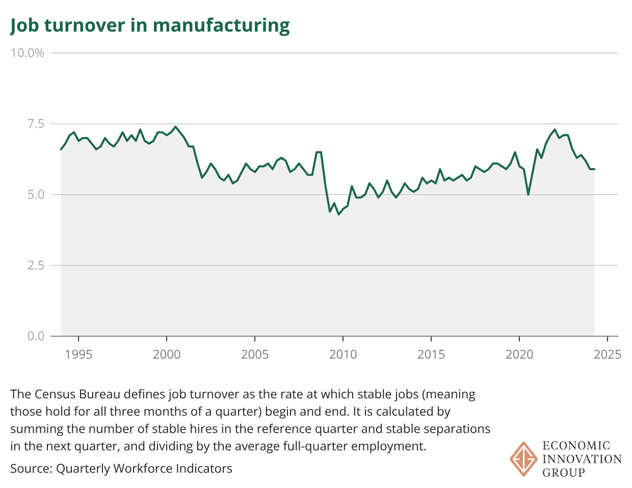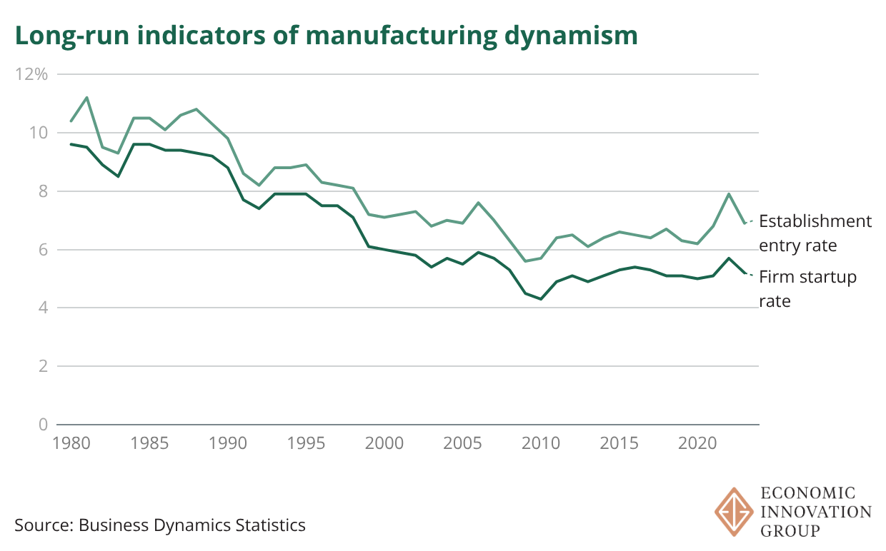 U.S. manufacturing as a whole looks static and far less dynamic than its potential. Your friends at EIG confidently posit that the country will not durably reindustrialize without reinvigorating dynamism sector-wide and at scale.