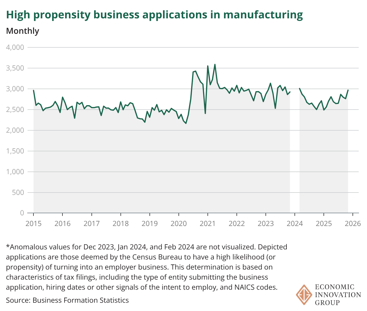 Filings for new manufacturing EIN numbers that bear the hallmarks of genuinely new firms intending to hire workers decreased in 2024 but climbed steadily in 2025, ending the year back at 2022 levels.