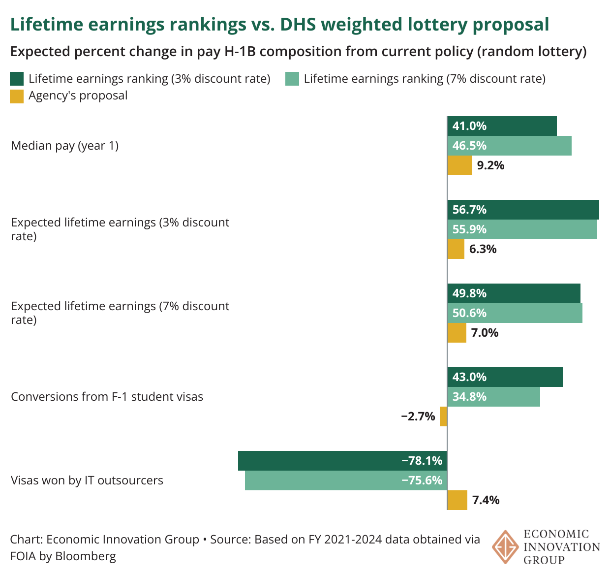 Using data on lottery winners from FY 2021 through FY 2024, we simulate and compare the effects of the current random lottery approach, the new DHS proposal, our preferred idea for a lifetime earnings approach (under both the 3 and 7 percent discount rates), and two other alternative options: a compensation-based ranking, and DHS’ 2021 rule that was vacated by a federal court and ultimately withdrawn.